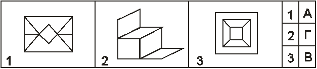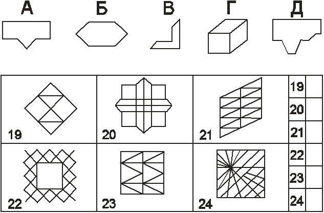 «Вам будут предъявлены сложные фигуры (изображения), в каждой из которых имеется один из простых эталонов, закодированных буквами А, Б, В, Г, Д. Вы должны найти в каждом случае, какой из этих элементов содержится в рисунке и указать его (набрать код элемента)».