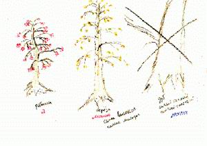 Почему в методике предлагается нарисовать именно три дерева? R.J. Corboz пишет, что это скорее не теоретические вывод, а наблюдение из практического опыта. Для праздника День матери дети должны были нарисовать деревья. Большинство детей рисовало три дерева, которые ярко характеризовали отношения ребенка с родителями. Тем самым дети интуитивно отражали особенности внутрисемейных взаимоотношений. Сравнивая деревья с членами семьи, дети обычно выбирают себя и родителей. Но иногда это может быть брат, сестра, бабушка, дедушка или любой другой человек, например, сосед (рис. 2). В этом случае в последующей беседе важно расспросить ребенка, почему он выбрал именно этих "членов семьи", а других вытеснил.